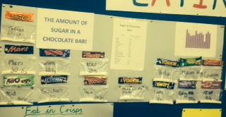 6th class were given the task of finding out how much sugar in different chocolate bars. Mars had topped our bar chart with 30.5g of sugar (7 and a half teaspoons). It turns out a Wispa bar had the least sugar with 20.5g (5 teaspoons).