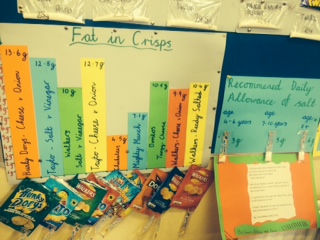 5th class did a lot of work on the amount of fat and salt in crisps. We were surprised to see a packet of Hunky Dorys has 13.6g of fat!!