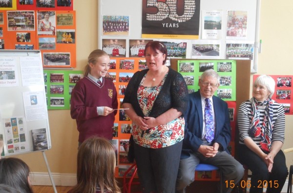 Pictured, below, is Jill receiving her prize from Festival Chairperson, Angela Murphy. Seated on the right of the photo are the two authors, Jim Murphy from Passage West and well-known author, Alice Taylor who was visiting the school on the same day, to talk to the pupils about her many books and to share some stories of school-days in the past, as part of the 50th Anniversary Celebrations.